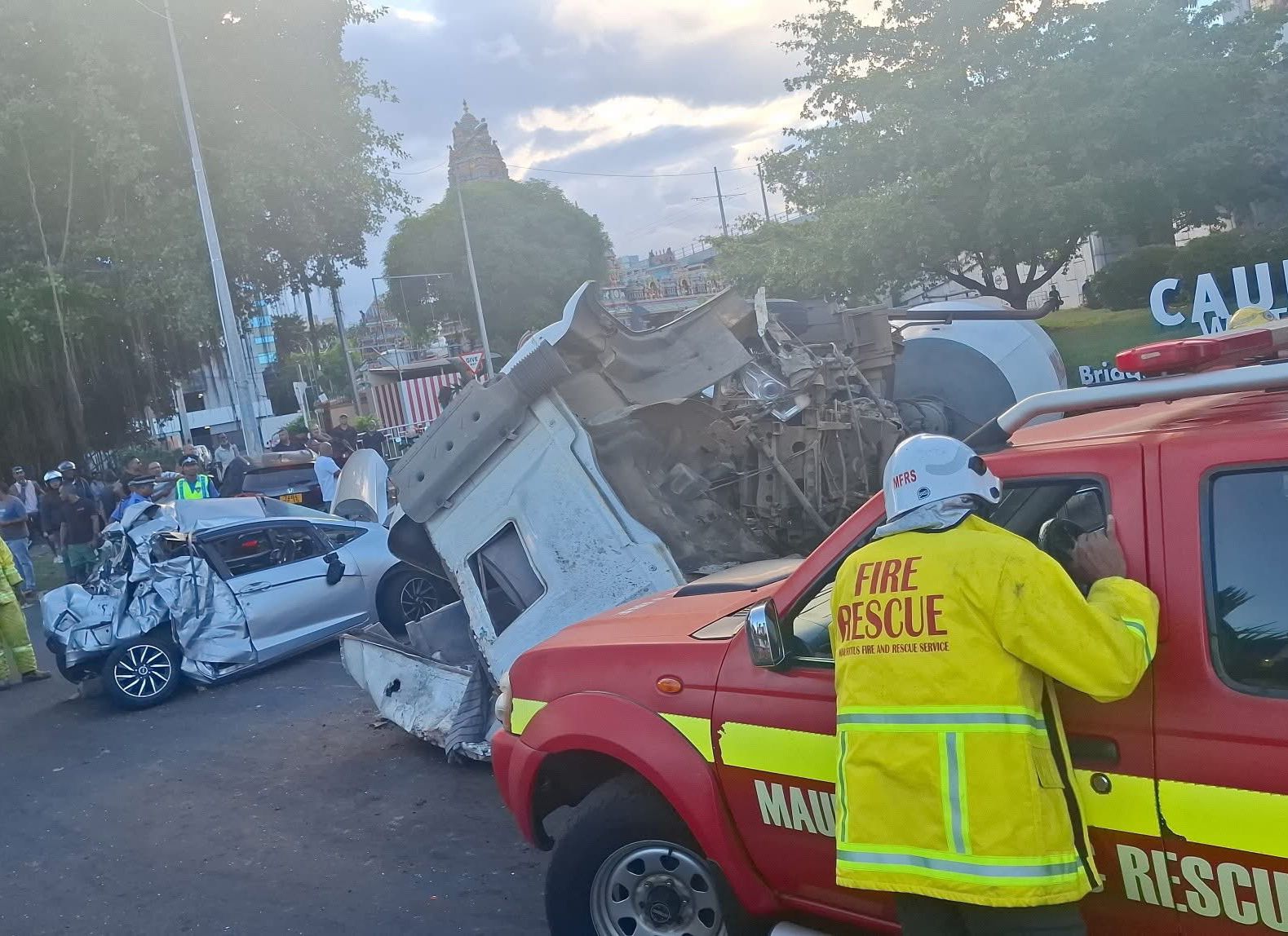 Le véhicule a terminé sa course sur le rond-point, causant des dommages à plusieurs véhicules. Les deux occupants du camion ont été hospitalisés au Dr Jeetoo Hospital. Leurs blessures ne sont pas considérées comme graves.