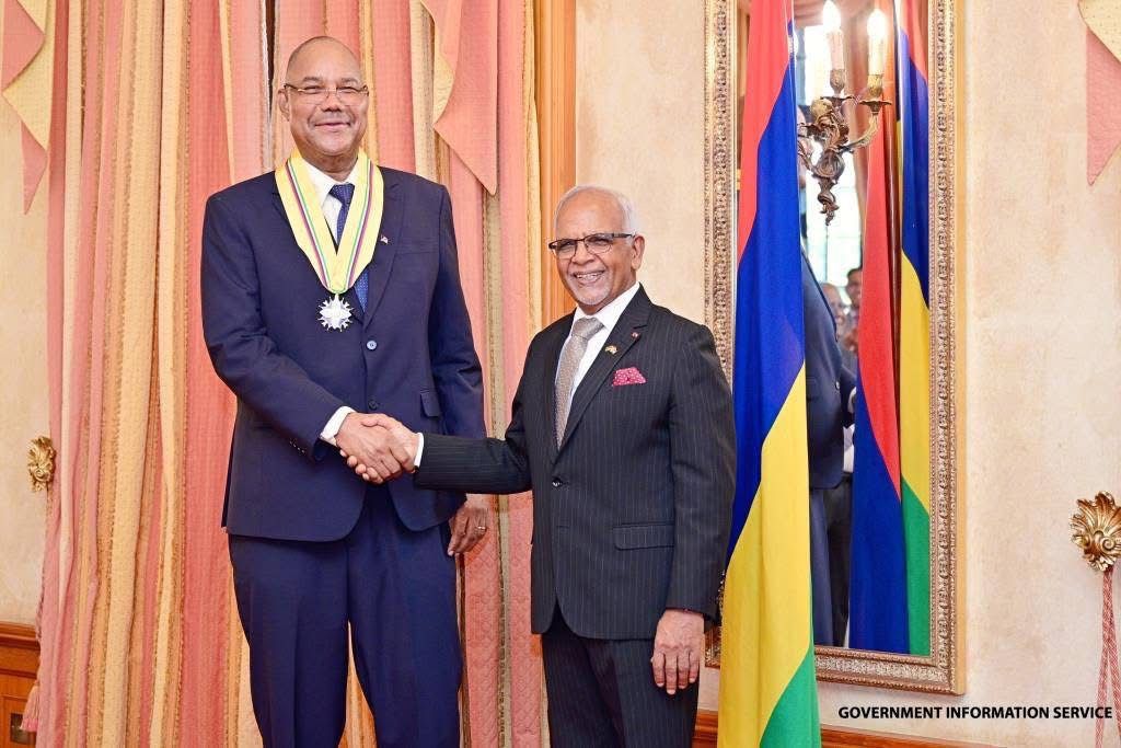 Dans le cadre des célébrations de la Fête nationale de Maurice, le Président de la République de Maurice, Dharam Gokhool, a remis au Président de la République des Seychelles, Patrick Herminie, la distinction de Grand Commander of the Order of the Star and Key of the Indian Ocean (G.C.S.K.). La cérémonie s’est tenue à la State House Réduit.Cette distinction, qui constitue la plus haute décoration nationale de la République de Maurice, a été attribuée au Président Herminie sur recommandation du Premier ministre mauricien, Navinchandra Ramgoolam. Elle vise à saluer les relations d’amitié de longue date ainsi que la coopération étroite entre Maurice et les Seychelles.La cérémonie a été suivie d’un déjeuner officiel offert par le Président mauricien en l’honneur du Président Herminie et de la Première Dame des Seychelles, invités d’honneur des célébrations de la Fête nationale cette année. Les deux chefs d’État ont également porté un toast à l’amitié et à la coopération entre leurs nations respectives.Plusieurs personnalités politiques et dignitaires ont assisté à l’événement, dont le Premier ministre, Navin Ramgoolam, le vice-Premier ministre, Paul Bérenger, ainsi que des membres du gouvernement et d’autres invités de marque.